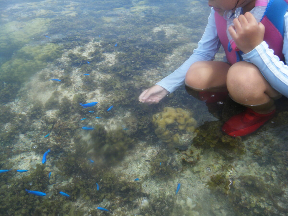 浅いところでは魚のすぐそばに行き、エサやりができる。