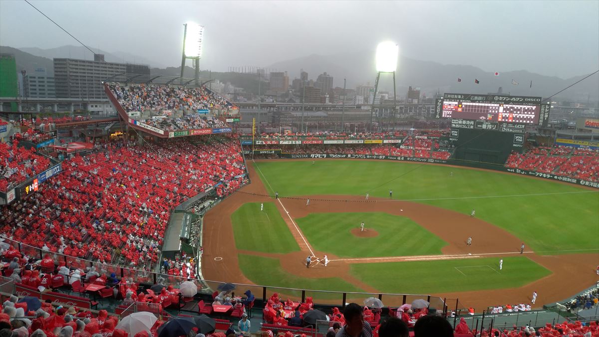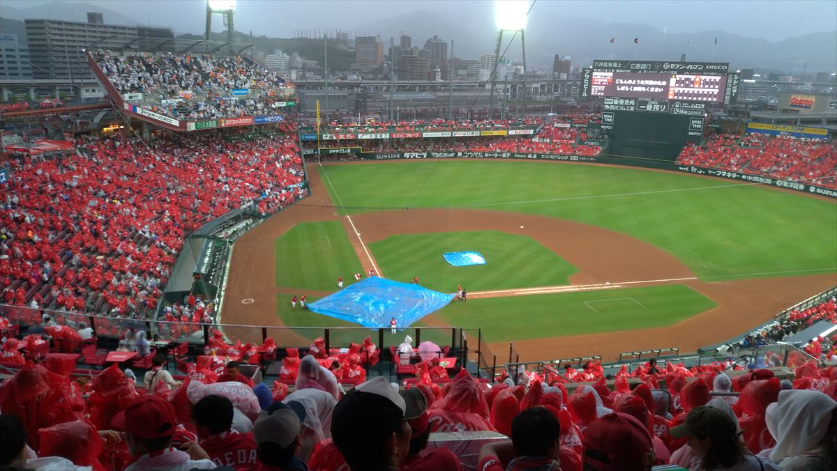 台風10号の影響で、上空はかなりの風が吹いています。バックスクリーン上の旗もバタバタ音を鳴らしていました。スマホで雨雲レーダーを確認すると、雨はやみそう。ドル箱の巨人戦しかもお盆で帰省している全国のカープファンが集まっているマツダスタジアム。中止になるわけがありません。20分くらい中断したんでしょうか?グランド整備が始まり、試合が再開されました。