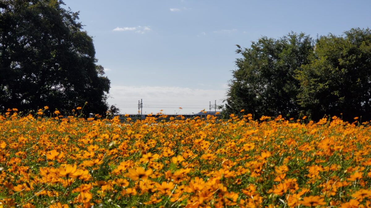 武庫川河川敷のコスモス550万本!新幹線と一緒に撮影する人々