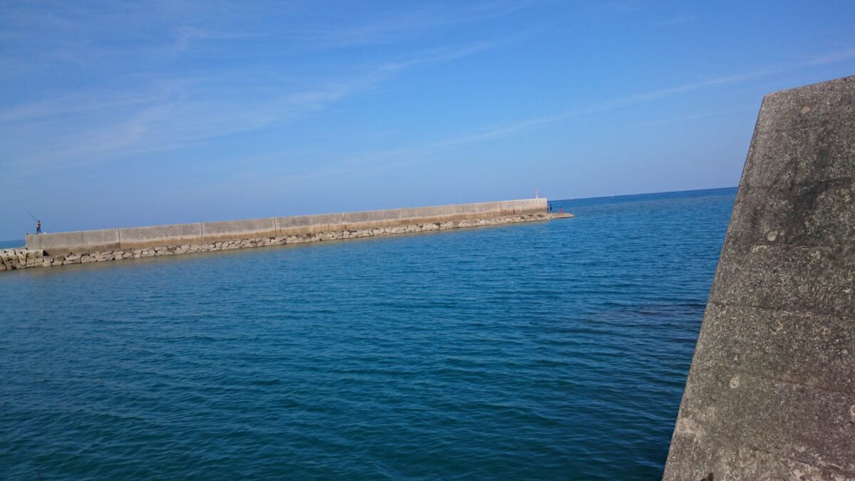 空いていたので、釣り場は海に向かって右側の堤防の一番先、歩いて5分ほど。