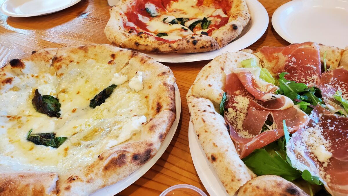 我が家はマルゲリータ、ビアンカネーヴェ、クワトロ、季節のピザを4人で注文し何とか食べきりました。