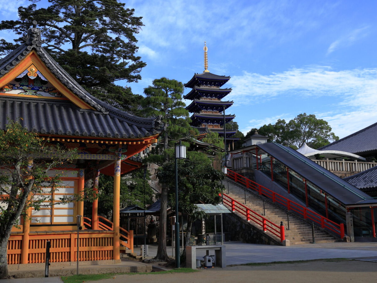 一礼して山門をくぐると青い五重塔が目に飛び込んできます。