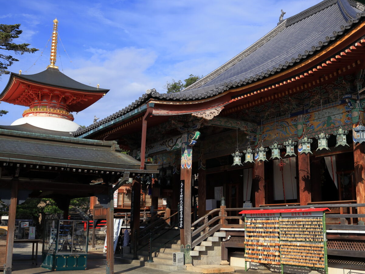 五重塔から本堂へ向かう階段から護摩堂の屋根が見えます。