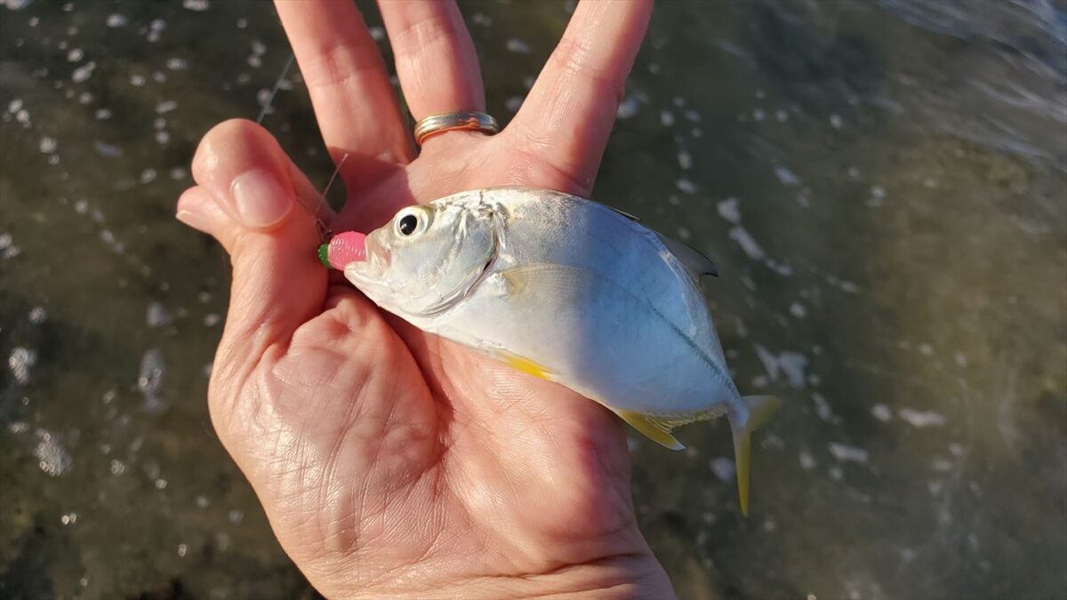 私は、メギスにダイソーシャッドテールワームを食いちぎられないように注意しながら、オグロトラギスミーバイメギスを合わせて5匹ほど釣って楽しみました。